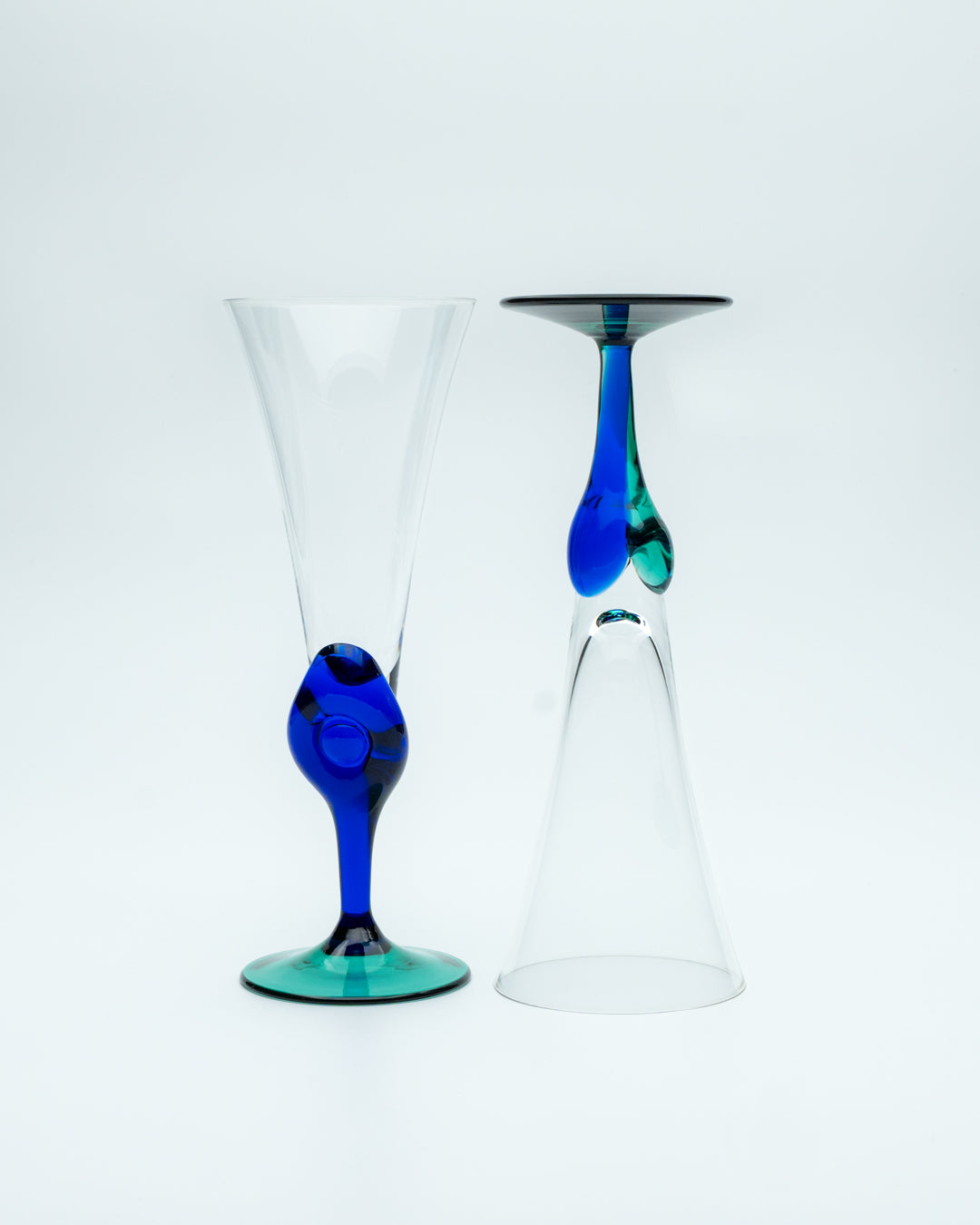 Nothing has to be ordinary in your home, and these green and blue glass flutes definitely help with that. They each have a unique stem and are here to make a statement.