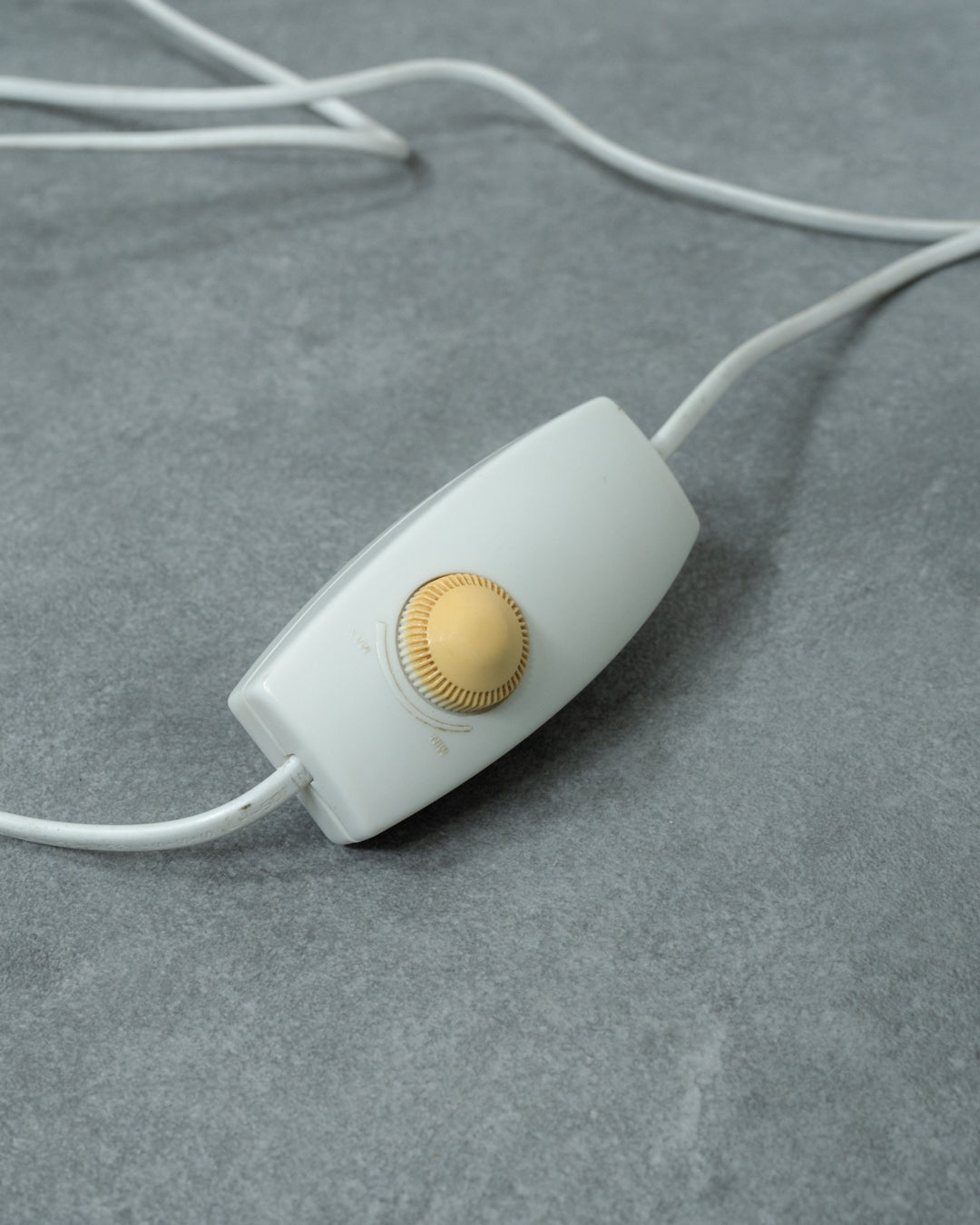 Condition Good vintage condition. Light wear consistent with age and use. Some light scuffs on the plastic and on the bottom of the aluminum. The dimmer is still working, but the plastic of the button is a little bit discolored.